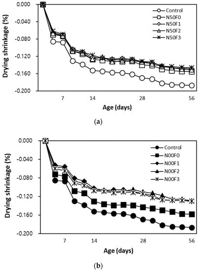 Figure 9 shows the changes in the drying shrinkage of mortar using steel slag aggregate and AMFs with respect to the age (in days). The drying shrinkage after 56 days of aging the control sample is the highest at approximately 0.186%. Figure 9a shows that the drying shrinkage of the N50F0 sample without AMFs is approximately 0.155%, while that of the sample with AMFs is approximately 0.145–0.150%, which is approximately 24.0–28.2% lower than that of the control sample.