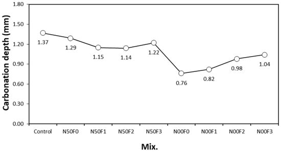 In addition, the carbonation depths of the N00 samples, which used more steel slag aggregate, and those of the N50 samples, were lower than those of the N50 samples. For the N50 mixtures using 50% natural fine aggregate, the carbonation depth of the sample using AMFs was relatively low, and appeared to be similar regardless of the amount of AMF used. For the N00 mixtures using 100% steel slag aggregate, the carbonation depth of the mortar sample increased as the amount of AMF increased. This could be because the inflow of CO2 into the voids of the bond surface between the cement matrix and AMFs in the N00 samples was relatively higher than that in the sample without AMFs. However, the carbonation depth of the N00F3 sample, which was largest among the mortar samples containing 100% steel slag, was also lower than that of the control sample or those of the N50 samples.
