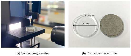 To measure the water contact angle, the mortar was poured into a Ø 3.5 cm × 0.5 cm petri dish and cured at a temperature of 20 ± 2 °C and a humidity of 50% for 28 days. After curing, the surfaces were abraded by 2 mm using a 100-grit sandpaper. The contact angles of the samples before and after sandpaper abrasion were measured using a Pico contact angle meter in accordance with the KS L 2110 wettability test method for a glass surface. Figure 1 shows the contact angle measurement and the measurement specimen.