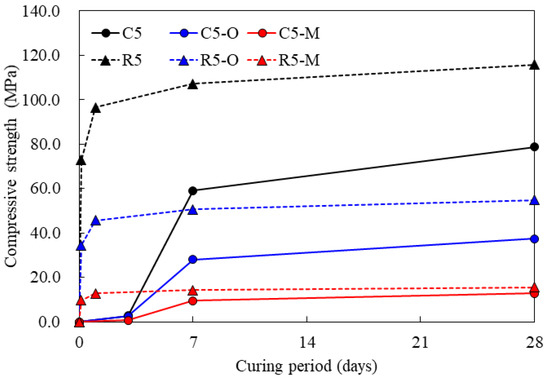 With regard to the compressive strength, the rapid-hardening cement exhibited a higher strength than that of OPC. The compressive strength of OPC mortar at 28 days was found to be 78.7 MPa for C5, 37.4 MPa for C5-O, and 12.8 MPa for C5-M. Thus, the addition of water repellents to the mortar mixture with OPC reduced its compressive strength. Here, compared to the compressive strength of the mortar with no water repellent, the compressive strengths of mortar mixtures with oligomer and monomer water repellents were approximately 47% and 16%, respectively, indicating that the latter further reduced the strength of the mortar more.