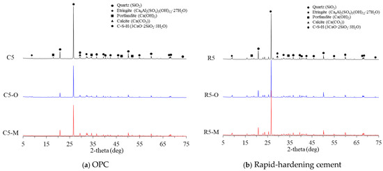 In the case of the rapid-hardening cement mortar, all the mixtures of R5, R5-O, and R5-M exhibited the Ca(OH)2 peak. In addition, a peak corresponding to ettringite could be observed at 2θ = 9°.