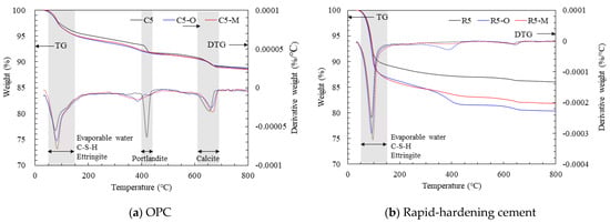 The main regions of the mass loss and differential scanning calorimetry (DSC) peak of hydrated compounds are 50–150 °C, 400–450 °C, and 650–800 °C. The decomposed compounds for each section are evaporable water, C-S-H, and ettringite in the 50–150 °C region; portlandite in the 400–450 °C region; and calcite in the 600–700 °C region. Portlandite was selected as an indicator of the hydration reaction because it is formed due to the hydration of C3S and C2S [19,20].