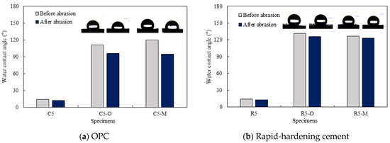 As shown in Figure 5b, the contact angles were measured to be 132° for R5-O and 126° for R5-M; however, the contact angle could not be measured for R5, as the water droplets were absorbed on the surface. After surface abrasion, the contact angle decreased to 126° for R5-O and 123° for R5-M, but the reduction rates were less than 5%. As can be seen in Table 4, the OPC mortar and rapid hardening cement mortar with the water repellent showed a rough surface with the sand exposed in the abrasion; however, the contact angle of the super-velocity cement mortar was still greater than 120°. The rapid-hardening cement mortar mixed with water repellents exhibited a larger water contact angle than that of the OPC mortar. The former improved the internal hydrophilicity while maintaining the contact angle even after abrasion.