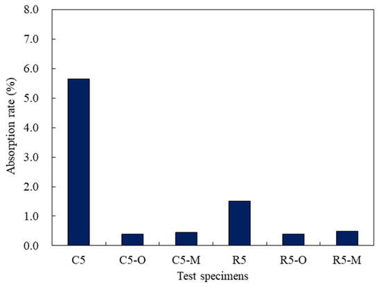 Figure 6 shows the water absorption of the cement mortar mixed with water repellents. The water absorption rates were found to be 5.65% for C5, an OPC mortar with no water repellent, and 1.51% for R5, a rapid-hardening cement mortar. It was less than 1% for the cement mortar mixed with water repellents for all cement types. The water absorption of the cement mortar was significantly less because water repellents prevent water penetration by forming a smooth film on the mortar samples [22]. The water repellents developed hydrophobicity in the cement mortar and effectively prevented the infiltration of external water. They maintained a very low absorption rate even though the strength of the cement mortar was reduced. Mortar without resin has a very low water-carrying capacity, but resin-like mortar exhibits a high hydrophobicity. Organosiloxane changes the hydrophilic surface of the capillary to a hydrophobic surface because it contains several hydrocarbons in its structure [14]. This appeared to improve the hydrophobicity of the surface without water absorption.