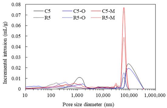In the case of C5-O, in which the oligomer water repellent was added to the OPC mortar, the presence of siloxane –Si-CH3 was confirmed because a –CH3 stretching peak at 2975 cm−1 and Si–CH3 stretching peaks at 1265 and 791 cm−1 were observed. For C5-M, in which a monomer water repellent was added to the OPC mortar, –Si-CH3 could be confirmed as Si–CH3 stretching peaks were observed near 1265 and 800 cm−1.