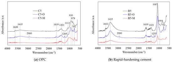 In Figure 8a, the FT-IR peaks of the hydrated OPC mortar show O–H stretching at 3435 and 3649 cm−1, O–H bending at 1639 cm−1, C–O stretching at 1421 and 878 cm−1, S–O stretching at 1121 cm−1, and Si–O stretching at 930 cm−1. The peaks of Si–O–Si due to the aggregate of mortar could be observed at 1105 and 950 cm−1, but it was difficult to confirm that they overlapped with the peak of Si–O stretching.