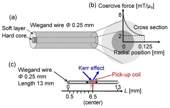 A bistable magnetic structure is formed in FeCoV wires by twisting and annealing treatments. The magnetic properties of FeCoV wires have been reported in terms of annealing and torsion stress [19,20]. After the wires are twisted, their outer layers near the surface become magnetically soft with a low coercivity, whereas the center core remains magnetically hard with a high coercivity [20]. The coercive forces of the magnetically soft and hard regions are approximately 2 and 8 mT/μ0, respectively, although they depend on the preparation conditions and the length and diameter of the wires. Here, μ0 represents the permeability in vacuum. In fact, the coercive force in the wire is considered to gradually vary along the radial direction.