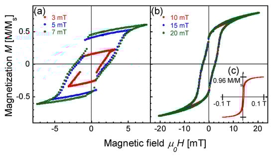 Figure 2c, the insertion in the figure, shows a part of the major loop (from −0.1 to 0.1 T/μ0) traced under the maximum intensity of the applied magnetic field of Hap = 0.3 T/μ0. The magnetization of the wire is 0.96 of Ms and almost saturates at 0.1 T/μ0, as shown in the figure, where Ms is the saturation magnetization.