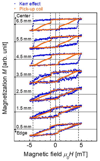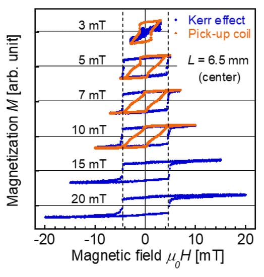 The magnetization curve obtained from the voltage induced in the pick-up wound around the wire was also evaluated. As shown in Figure 1c, the position of the pick-up coil with 100 turns was varied, L = 0.5–6.5 mm, similar to the measurement area of the MOKE measurement. As the width (length along the wire direction) of the pick-up coil is 0.6 mm, the magnetization reversal at the position of the coil, not the entire length of the wire, contributes to the magnetization curves determined by this method [27]. An alternating magnetic field |Hap| = 3 to 10 mT/μ0 at 20 Hz was applied. The magnetization curves measured under this field frequency can be considered to represent a static magnetization process, which is equivalent to the magnetization process measured using the VSM and MOKE. The maximum intensity of Hap was 10 mT/μ0 in this measurement, which was limited by the alternating current power supply used in the present study. The voltage induced in the pick-up coil was measured, which was proportional to , which is the time differential of the magnetic flux Φ penetrating the cross section of the wire at the pick-up coil position [28,29].