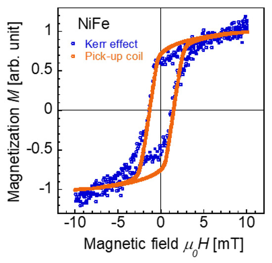 Magnetization curves of the NiFe wire obtained by the MOKE and the voltage induced in the pick-up coil. The diameter and length of the wire are 0.25 mm and 20 mm, respectively. The measurement position is at the center of the wire. An alternating magnetic field of |Hap| = 10 mT/μ0 is applied.