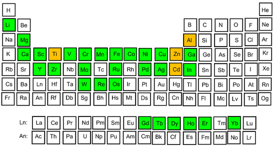 Chemical elements forming thermodynamically stable QCs. Main forming elements (Al, Ti, Zn, Cd) are marked by orange color, alloying elements are denoted by green.