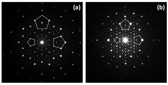 In Figure 5, the comparison of electron diffraction patterns of both QC and quasicrystalline approximant is shown. The electron diffraction pattern of the QC (Figure 5a) has a perfect five-fold symmetry. The electron diffraction pattern of a quasicrystalline approximant (Figure 5b) with an orthorhombic unit cell has either two-fold or four–fold axis of symmetry, but there are indications of five-fold symmetry related to the icosahedral arrangement of atoms in clusters [10,11,52,53,54,55,56,57,58,59].