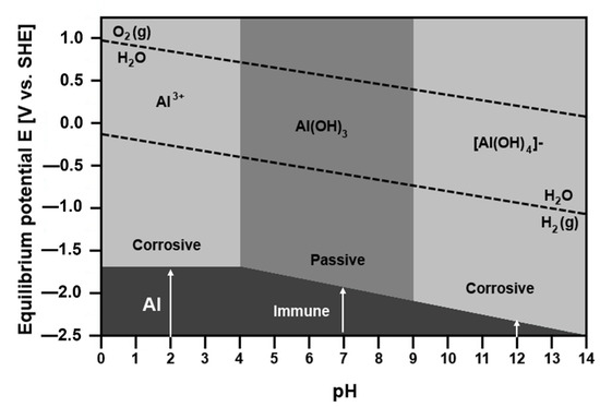 Standard electrode potentials of metals are compared in Table 2. Since the Gibbs energy is related to electrode potential (Equation (3)), the tendency of a metal to corrode in given environment may be evaluated using E–pH plots. The diagrams have been calculated for most metals by Pourbaix and are available in ref. [69]. Figure 7 displays the E–pH diagram for Al–H2O system [69,70]. The plot indicates the stability regions of different phases in aqueous solutions. The E–pH diagram shows four different regions where metallic aluminum, aluminum cations (Al3+), aluminum hydroxide and complex anion [Al(OH)4]− are stable. The region, where the metallic Al is stable, is labelled as immunity region. The areas with aluminum cations and anions as stable species are marked as corrosive regions. In these areas the corrosion occurs. The passivity region is where the solid hydroxide exists. In this region, Al is protected by a passive layer. The E–pH diagram demonstrates that corrosion takes place in both alkaline and acidic environments. The protective layer is formed at pH 4–9 [71]. The diagram also shows that the equilibrium electrode potential between [Al(OH)4]− and Al, shifts to less noble values with increasing pH.