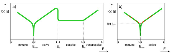 A schematic potential versus current density curve recorded during the polarization experiment is given in Figure 8. Several different regions can be distinguished on the curve. The first region is immune region. In this region, observed at low potentials, the metal is thermodynamically stable. In immune region, cathodic reactions prevail at the metal surface. The second region is labelled as active region. It is observed once a corrosion potential, Ecorr, has been reached. In the active region, the metal actively corrodes according to Equation (2). The active corrosion means that the anodic dissolution of the metal takes place in the studied solution. Some metals can passivate. Therefore, a passivation region can be also observed on the polarization curve. The passive region corresponds to passive layer formation on the metal surface. The passivation is reflected by rapid current density increase or stabilization at potentials higher than Ep (passivation potential) on the polarization curve. At very high potentials, the current may start to abruptly increase. The increase is a result of passive film breakdown and happens at potential higher than transpassive potential, Etr. The passive film breakdown may be initiated by aggressive halide anions and lead to localized corrosion (pitting). A given alloy system may contain either some or all regions shown in Figure 8a.