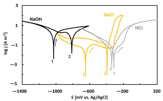 The forward curves were evaluated by Tafel extrapolation and corrosion currents and corrosion potentials were obtained [86]. The lowest corrosion potential and highest corrosion current were found for NaOH. The highest corrosion potential and lowest corrosion current, on the other hand, were observed for the HCl solution. This behavior is in accordance with equilibrium E–pH diagram of Al (Figure 7).