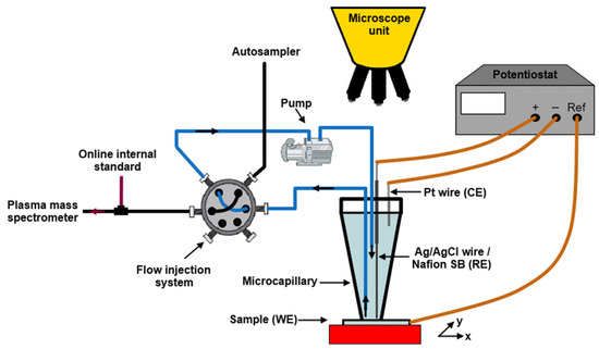 The passivation behavior of Al–Cr–Fe alloys was studied by Ott et al. [91] The authors used a flow microcapillary plasma mass spectrometry. The schematic of the experimental set up is shown in Figure 13 [91]. In the experiment, a tiny microcapillary was positioned on the alloy surface and continuously filled with the desired solution. The flow injection was operated in loops by switching the valve. The loop volume was continuously transferred to the inductively coupled plasma mass spectrometer (ICP MC) for element analysis. The microcapillary was refilled with fresh electrolyte from the reservoir. The circulation was ensured by a peristaltic pump. A microscope was included to control precise positioning of the capillary on the alloy surface. The technique provided time-resolved information about transient electrochemical processes and element-specific dissolution at the metal–electrolyte interface.