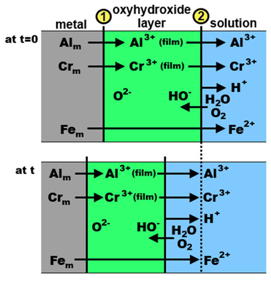 The authors prepared and studied a polycrystalline γ-phase Al64.2Cr27.2Fe8.1 alloy (composition given in at.%, [91]). The corrosion behavior was studied in two acidic solutions: H2SO4 (pH 0) and HCl (pH 2). In sulfuric acid, very low element dissolution rates were found. Neither Fe nor Al is stable at low pH [69]. Therefore, Cr is an essential element in the passive film stability. It helps to stabilize the Al cations within the passive film, as evidenced by a low Al release over 2 h. A possibly mixed oxy-hydroxide of Al and Cr was suggested to have been formed on the alloy surface (Figure 14, [91]). The dynamic passivation mechanism is related to the fact that the cation dissolution occurring at the oxyhydroxide–solution interface (②) is compensated by additional film growth at the metal–oxyhydroxide interface (①). Longer air-aging was found to be beneficial for stabilizing the passive film.