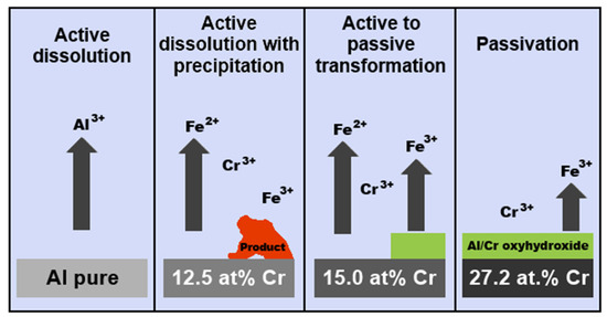 Schematic of the passive film evolution on γ-phase Al64.2Cr27.2Fe8.1 alloy, re-drawn from reference [91].