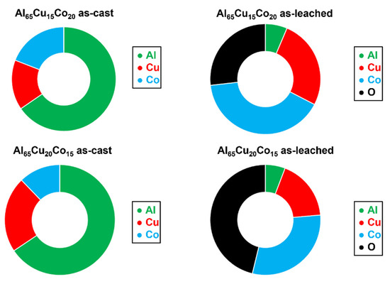 The corrosion behavior of Al–Co complex metallic alloys with 24–29 at.% Co was studied by Palcut et al. [83,84]. The following relative nobility of Al–Co CMAs has been found:
