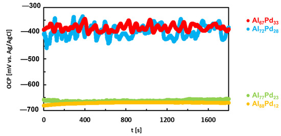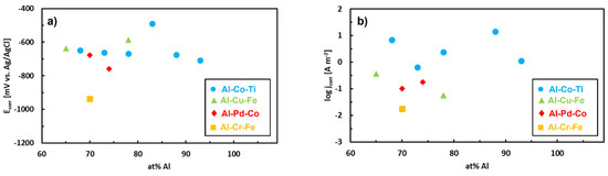 The Al–Cr alloys are expected to demonstrate a good corrosion resistance due to high concentrations of Al and Cr [89]. Both are passivating elements producing protective scales. The corrosion resistance of an Al70Cr20Fe10 alloy was studied by Li et al. [90]. The authors used commercial gas-atomized Al70Cr20Fe10 powders that were consolidated by spark plasma sintering. The phases present in the sintered Al–Cr–Fe pellets were the following: an icosahedral phase (i–Al–Cr–Fe), decagonal phase (d–Al–Cr–Fe) and crystalline Al8(Cr,Fe)5 and Al9(Cr,Fe)4 phases. Authors measured an open circuit potential (OCP) of the alloy in 3.5 wt. % NaCl and found that the OCP was nobler compared to Al. The OCP of the alloy was stable over time, indicating that an equilibrium has been rapidly established on the alloy surface. The Al70Cr20Fe10 alloy had a nobler corrosion potential and hence a lower susceptibility to corrosion compared to Al. It passivated in saline solution spontaneously due to significant amount of Cr. The alloy had a higher corrosion rate compared to pure Al [90]. Nevertheless, the corrosion rate was close to that of 316 stainless steel and smaller than AISI 440C stainless steel or AISI H13 tool steel.