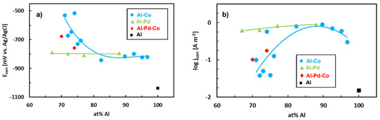 A potentiodynamic polarization behavior of the Al–Co alloys in aqueous NaCl has been studied in refs. [81,82]. The Al96.7Co3.3 alloy showed a slightly superior corrosion performance compared to the remainder of the alloys as it had a relatively low corrosion current. Nevertheless, all Al–Co had a substantially higher corrosion resistance compared to Al. The anodic dissolution behavior was found to consist of four stages [81,82]. The individual stages were assigned to the following processes: