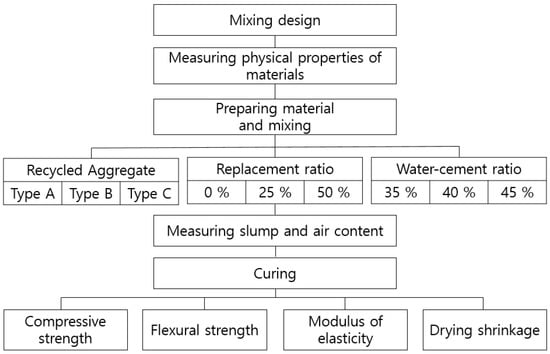 The objective of this study was to demonstrate and thus promote the practical use of B-RA on Jeju Island. As a basic experiment for this, it aims to apply concrete secondary products, and is an experiment to analyze the effect of the quality of recycled aggregates on concrete. The experimental plan designed for this purpose is presented in Table 1, in which inland quartz natural aggregate (NA) and basalt from Jeju Island (BA) were evaluated as base aggregates. The use of three types with different quality improving process of recycled aggregates (RA-A, -B, and -C) was evaluated as a BA replacement in ratios of 0, 25, and 50%. The quality of the recycled aggregates was enhanced using direct and indirect impact force methods. The mix proportions of the concretes containing recycled aggregate and basalt are listed in Table 2. These mixes were used to evaluate three variables: water–binder ratio, recycled aggregate type, and recycled aggregate replacement ratio. Therefore, nine mix proportions were obtained based on the Taguchi experimental design method. Its method allows to find the optimal conditions of experimental factors and levels in mix design of concrete. The three mix proportions were added using the NA. The unit cement content and sand–aggregate ratio was fixed at 350 kg/m3 and 45%, respectively. In experimental terms, the slump and air content were measured as the fresh concrete properties, whereas the unit mass, compressive strength, flexural strength, modulus of elasticity, and drying shrinkage as the hardened properties. Figure 1 shows flowchart for concrete experiment.
