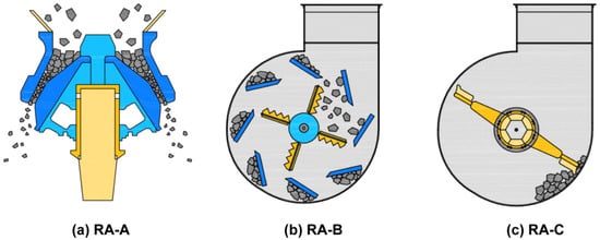 Type 1 ordinary Portland cement from Company S (Danyang-si, Korea) was used in the experiment, which satisfied the physical properties and chemical composition according to ASTM C150:2020 [29], as shown in Table 3 and Table 4. The compressive strengths of the cement used were 23, 29.3, and 42.5 MPa, respectively, for 3, 7, and 28 days. The initial setting was 270 min. Aggregate sizes of 25 mm were used for both the NA and BA, satisfying the requirements of ASTM C33:2018 [30]. The quartz NA was obtained from aggregate quarries in Cheonan-si. The BA was mixed from three Jeju Island quarries and exhibited an irregular shape with a porous surface and a higher absorption (2.66%) than the NA. The B-RA was made using waste concrete of Jeju Island and manufactured by a waste disposal company in Incheon Metropolitan City and Hongseong-gun. The quality of all B-RA was enhanced through processing for use in a subbase course with an absorption of 7.25%. Figure 2 shows the manufacturing process of each type of B-RA. RA-A was manufactured by crushing aggregates with direct impact force using a crusher. The RA-B manufacturing process first sends aggregates via a bucket to upper part of equipment and aggregate is free-fall to blade. After that, it produces aggregates by applying an impact force to the surface of aggregates using high-speed rotating blades and detaching plates. RA-C is prepared by crushing or scratching aggregate surfaces using the space between rotating blades and drums. The above process has been employed in manufacturing B-RA (RA-A, RA-B, RA-C) of 20 mm size. The quality of RA-A was slightly enhanced by direct impact force on the aggregate itself. RA-A of the average aggregate size was smaller than those of RA-B and RA-C. The quality of RA-B and RA-C was more enhanced by the application of indirect impact force to the surfaces of the aggregate layers. The shapes of the coarse aggregates used in the experiment are illustrated in Figure 3, and their physical properties are listed in Table 5. Although the quality-enhanced recycled aggregates exhibited varied density and absorption, their absorption failed to satisfy the quality standard for recycled aggregates regulated in South Korea (3%). Nevertheless, the quality was remarkably enhanced in compared to the raw recycled aggregate material (7.25% absorption). The impurity content of the recycled aggregate was managed to be less than 1% and used.