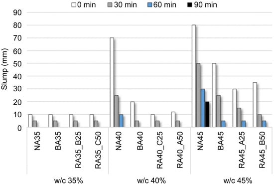 The slump of the concrete according to the replacement ratio and quality of the basaltic recycled aggregate is charted in Figure 4, which depicts an evident reduction in slump with decreasing water–cement ratio. Similar to existing recycled aggregate concretes, the BA concrete exhibited a decrease in slump with increasing replacement ratio of BA with B-RA [37]. These results demonstrated significant differences, including large reductions in slump over time, even for concrete samples of 100% NA and BA because the increase in aggregate specific surface area owing to the irregular shape of the BA reduced the flow-paste content. In addition, the decrease in slump could have been influenced by the high absorption of the BA and B-RA used in the experiment, as the repeated absorption and discharge of the mixed water during agitation apparently decreased the mixed water content, influencing the slump.