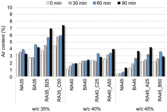 The air content of the fresh concrete according to B-RA quality and replacement ratio is charted in Figure 5, which indicates that the air content tended to decrease with increasing water–cement ratio owing to the improved concrete-filling ability facilitated by the corresponding increase in fluidity. In addition, the air content increased with the use of BA and larger replacement ratios of BA with B-RA. Furthermore, the rate of increase in air content over time increased for all evaluated mix proportions. This could be attributed to the absorption of mixed water by the BA and B-RA, which caused the air content to gradually increase as the moisture continuously flowed in and out of the aggregate over time [38].