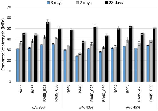 Compressive strength of concrete specimens according to water–cement (w/c) ratio.