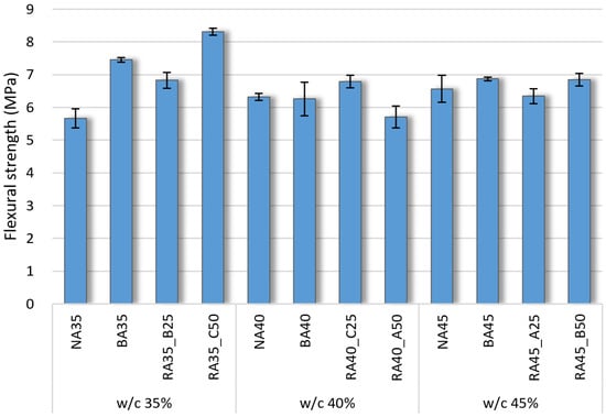 The flexural strengths of the hardened concrete specimens according to B-RA quality and replacement ratio are depicted in Figure 7, which indicates that—similar to the compressive strength—the flexural strength was not significantly impacted by the variations in water–cement ratio, as the decreasing unit water content degraded the quality of the paste. The flexural strength of the BA specimen was higher than that of the NA specimen owing to the advantages of the irregular and elongated shape of the BA aggregate. Among the B-RA specimens, the largest flexural strength was exhibited by RA35-C50 at 8.3 MPa because of its mixture of large particle-sized aggregates; however, as shown in Table 5, the quality of the RA-C aggregate in terms of fineness modulus was 6.71, while that of RA-B aggregate was 6.91. Furthermore, the old paste on the surface of the B-RA seemingly enhanced the adhesion between the new paste and the recycled aggregate, thereby contributing to the increase in flexural strength [39,40]. Moreover, the results for the RA-A specimens indicated their vulnerability to bending stress owing to the low quality and small size of this aggregate.