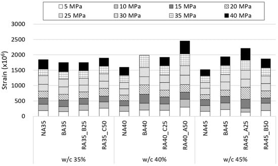 The strain of the hardened concrete specimens according to stress and the corresponding moduli of elasticity are shown in Figure 8 and Figure 9, respectively, according to B-RA quality and replacement ratio. The figures indicate that the modulus of elasticity did not vary significantly with the water–cement ratio because the reduced unit water content deteriorated the paste content and fluidity of the specimens. The modulus of elasticity of the BA specimens was lower that of the NA specimens because of the high porosity of BA, even for the same aggregate contents [41,42]. Moreover, the modulus of elasticity did not significantly decrease for a B-RA replacement ratio of 25%; instead, that of RA-B 25% actually increased to 25.9 GPa, which is almost equal to that of the NA specimen. Although the moduli of elasticity slightly decreased for the RA-B and RA-C specimens with 50% recycled aggregate, it remained in the range of 22–24 GPa. However, the modulus of elasticity of the RA-A 50% specimen significantly decreased to 19.1 GPa. Thus, the modulus of elasticity is a characteristic value that varies with the quality of the aggregate; indeed, the modulus of elasticity of porous aggregate concrete such as recycled aggregate and lightweight aggregate is known to decrease with increasing aggregate porosity [43,44,45]. Although the aggregate porosity of RA-B and RA-C was higher than that of BA, there was no considerable difference in their moduli of elasticity. Indeed, the modulus of elasticity yielded a more positive relationship in the experiment to the increasing aggregate porosity, reflecting an increase in the solid volume percentage of aggregate owing to the replacement of BA with B-RA. Accordingly, the RA-B and RA-C specimens exhibited moduli of elasticity equal to or higher than that of the BA specimens.