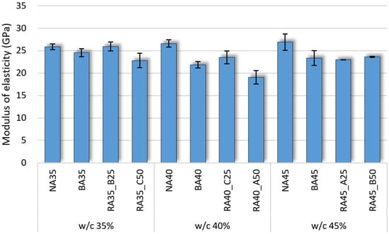 Modulus of elasticity of concrete specimens according to water–cement (w/c) ratio.