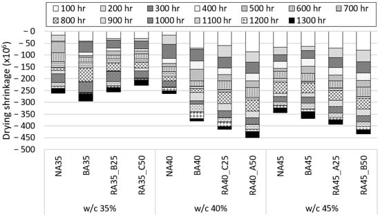 Drying shrinkage of concrete specimens according to water–cement (w/c) ratio.