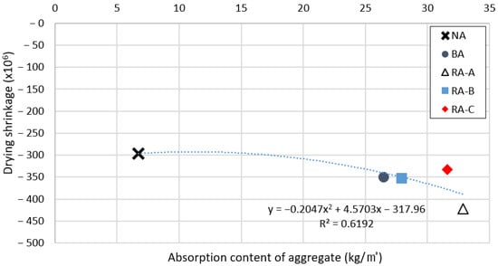 The drying shrinkage results for the concrete specimens according to the B-RA replacement ratio after 1400 h are charted in Figure 11, and the relationship between the aggregate absorption content and drying shrinkage of the concrete specimens is depicted in Figure 12. It can be observed that an increase in the B-RA replacement ratio directly increased the drying shrinkage of the concrete, because the addition of water in the process of converting the aggregates into a saturated dry-state surface increased the evaporated water content in the concrete mixing stage owing to the high absorption capacity of the recycled aggregate. Moreover, the cement paste was prone to drying shrinkage, similar to the old paste contained in the B-RA. Thus, an increase in the moisture content of the aggregate increased the drying shrinkage, exhibiting a nonlinear proportional relationship with R2 = 0.6192. In the figure, the absorption content of aggregate differs significant because NA aggregate exhibits a difference in absorption of aggregate of about 2% or more from those of the BA and B-RA aggregates. However, there was no significant difference between the drying shrinkages of the RA-B, RA-C, and BA specimens. As the recycled aggregates were also made from basalt, the weak paste was removed by the old-paste removal process conducted during aggregate recycling. Consequently, the relatively dense structure of the stronger old paste remaining in the RA-B and RA-C specimens did not significantly influence the drying shrinkage of the concrete.