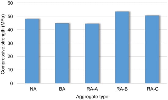 The average compressive strength of the concrete specimens according to the various aggregate types is shown in Figure 13, in which the NA and BA specimens do not contain recycled aggregates, whereas RA-A, RA-B and RA-C specimens contain 25–50% recycled aggregates. The BA specimen exhibited a lower compressive strength than the NA specimen and a similar strength to that of the RA-A specimen. Notably, the RA-B specimen exhibited the highest compressive strength among all specimens, though the RA-C specimen exhibited a higher compressive strength than the NA. The high porosity and low aggregate strength of the BA degraded the strength of the concrete in which it was included. However, recycled aggregates of homogeneous particle size above a certain level of quality contributed toward improving the compressive strength of the concrete by increasing the solid volume percentage of the aggregate.