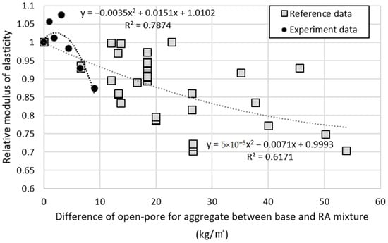Figure 14 displays the nonlinear, inverse relation between the difference of water absorption content for aggregate and the relative modulus of elasticity of the corresponding specimens. The water absorption content of aggregate refers to the pore that the aggregate can absorb and is expressed as open-pore. The figure shows the trends of basaltic recycled aggregate concrete used in this study and those from overseas for reference [47,48,49,50,51,52,53,54,55,56,57,58,59,60,61,62,63,64]. In reference data. Even though recycled aggregates were used, the difference in absorption rates between basalt and recycled aggregates was small for specimens with high relative elastic modulus. Conversely, the specimen with a low relative elastic modulus showed a large difference in the absorption rate of aggregates, and this tendency was R2 value of 0.6171. The higher the similarity between the pores of natural aggregate and recycled aggregate used in mixture, the higher is the relative modulus of elasticity, and this trend was evident form the results of this experiment, with a high R2 value of 0.7874. The basalt used in this experiment had more pores compared to those from overseas; however, pores of the recycled aggregate used in the experiment were not much different from those of basalt. Therefore, it is believed that it has a high modulus of elasticity when 25% of the recycled aggregate is replaced.