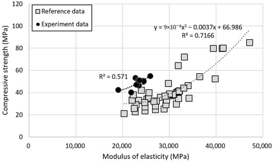 Figure 15 shows the relation between compressive strength and modulus of elasticity of the specimens used in this study, compared with other reference specimens. For both experimental and reference specimens, the compressive strength and modulus of elasticity tend to be proportional, and the experimental results showed an R2 value of 0.571 which was somewhat lower than that from the reference results. There are several cases of improved compressive strength via replacement of recycled aggregates that do have small difference in quality from natural aggregates in the region [65,66,67]. Using concrete with high strength is expected to compensate for the reduction in modulus of elasticity exhibited in recycled aggregate concrete. Although the compressive strength of the experimental data and the reference data specimen was similar, the elastic modulus showed a large difference. This trend is due to the properties of natural basalt. The absorption of basalt in the experimental data was 2.66%, while most absorption of basalt in the reference data was low less than 1%. In areas where natural aggregates with relatively high absorption rates exist, the increase in absorption due to the adhesion of old mortar is expected to have a relatively small effect on the physical properties of concrete.