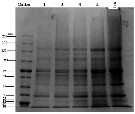 Based on the literature [25] and a slight modification, 4 mg samples (SPI, 11S, 7S, lower protein, and upper protein) were weighed and dissolved in a 1 mL phosphate-buffered solution. After full vortex mixing at 2000× g, 20 μL of the mixed solution was combined with 5 μL of loading buffer 5X and heated at 100 °C for 5 min. The samples were prepared and subjected to sodium dodecyl sulfate–polyacrylamide gel electrophoresis (SDS-PAGE) (JY-ECP3000, Beijing JUNYI Electrophoresis Co., Ltd., Beijing, China). SDS-PAGE was performed at a constant voltage of 150 V using 4–15% of a denaturing electrophoresis precast glue and stained with Coomassie brilliant blue, decolorized, and scanned.