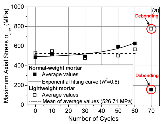 - The damage processes did not have an adverse effect on the σmax values for all of the specimens subjected to up to 60 freeze–thaw cycles. The proposed explanation for this phenomenon can be the late hydration of the mortars, which was in dynamic antagonism with those of frost heaving.