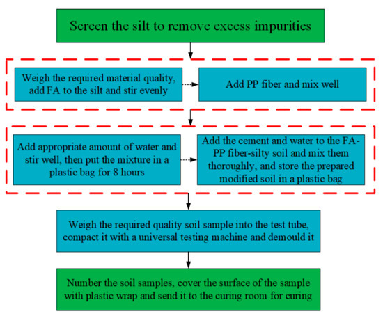 According to the Standard for “Test methods of Materials Stabilized with Inorganic Binder for Highway Engineering” (JTG E51-2009) [26], the preparation process of the test soil sample is shown in Figure 2, and the specific procedures are carried out in the following order: (1) Screening of the silty soil. The retrieved soil samples are air-dried and crushed, picked out of debris, and sieved so that they do not contain debris, weeds, etc. (2) According to the test plan, weigh the required quality with a high-precision electronic scale and add the weighed FA to the silt, cement, FA, PP fiber, and water, and stir evenly. (3) Add the weighed PP fiber to it and stir evenly (in order to prevent the fiber from clumping, it is added in a small amount several times, so that the fiber is evenly dispersed in the soil). (4) Then, add an appropriate amount of water (retaining 2–3% of the water content) and stir evenly, and then put the mixture into a plastic bag for 8 h. (5) Finally, 1 h before sample formation, add the weighed cement and reserved water to the FA–PP fiber–silt soil and fully stir, and store the prepared modified soil in a plastic bag. (6) Clean the test tube, let it dry for a period of time after wiping, apply a layer of lubricating oil on the inner wall and the surface of the cushion, weigh the mass of the mixture required for a single test piece, pour into the test tube at one time, adjust it so that the upper and lower cushion blocks are exposed to the same height, and then place it on the universal testing machine for compaction. After 2 h, put the test pieces on the demolding machine and number them. (7) Arrange the numbered soil samples neatly in the tray; then, cover the surface of all specimens with a layer of cling film and move them to the standard maintenance room (relative humidity above 95%, temperature 20 ± 2 ℃) for maintenance.