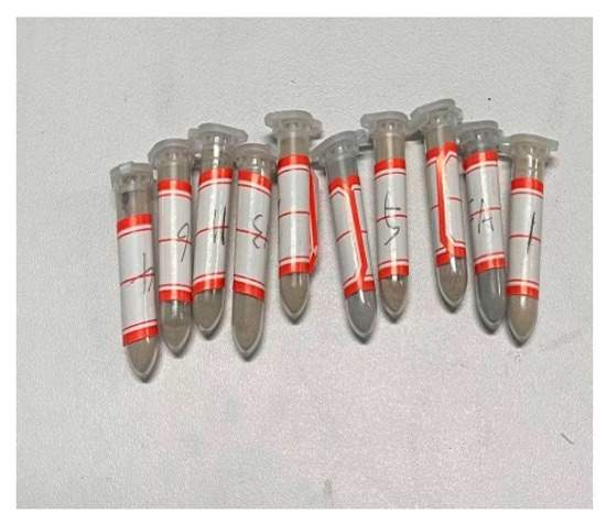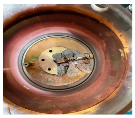 When carrying out the UCS test, the test can be carried out according to the above-mentioned test piece, and the sample was prepared by using a Φ50 × H50 mm cylindrical test mold. The SEM test requires cutting the specimen into larger pieces with a soil cutter, selecting a specimen with at least one flat section in the center of the specimen, and trimming it to a cube with a side length of about 1 cm using a soil trimmer; except for the freshly damaged surface, the remaining five surfaces can be cut flat. Before conducting the test, the specimen was glued to the small copper table using a carbon conductive adhesive, noting that the original damage section should be oriented upward as the observation surface, and the specimen fixed on the small copper table was put into the gold spray chamber and vacuumed before spraying gold. Figure 3 shows the specimen after gold spraying. When the specimen is maintained to the specified age, it is removed and cracked, and the specimen block at the center is put into the oven to dry at 30 °C for 12 h. Subsequently, the specimen was taken out and put into the grinding cup repeatedly, and the powder was poured onto a 0.075 mm sieve after grinding to a certain extent, and then, it was placed on a vibrating sieve machine for sieving treatment, with a sieve margin of no more than 10%. The sieved powder sample was sealed and stored in a catheter using a small spoon and numbered for XRD analysis, and the ground powder is shown in Figure 4.