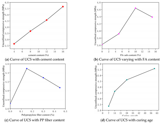 It can be seen from Figure 5a that the UCS and the cement content change basically linearly, and the effect of cement on the strength improvement is very obvious. When the cement content is 16%, the UCS is increased by 113.4% compared with the cement content of 4%. Figure 5b shows that with the increase in the FA content, the strength of the modified silt tends to increase and then decrease, and it reaches the peak strength at 10% of FA content, and its UCS increases by 28.2% compared with 0% of FA content. When the amount of FA is small, the reaction between FA and cement hydration products is insufficient, and the increase in strength is not obvious. At this time, FA is mainly embedded in the cement–soil gap in the form of particles. The strength of the modified soil was greatly increased when the FA content was increased from 5% to 10%, at which time the active SiO2 and Al2O3 in FA react with the hydration product Ca(OH)2 to produce many cementitious products such as calcium silicate hydrate (C-S-H) and calcium aluminate hydrate (C-A-H), which greatly increase the strength of the modified soil. When the FA content exceeded 10%, the strength of the modified soil gradually decreases. This is because the increase in FA leads to the reduce of cement content and silty soil in the modified soil, and the corresponding skeletal structure formed between the cement and soil is reduced, thus leading to the decrease in strength. Figure 5c shows that with the increase in the PP fiber content, the strength of the modified soil first increases and then decreases, which is similar to the change trend of FA. When the PP fiber content is 0.15%, it can be seen that the UCS increases by 21% when compared with the content of 0%. When the initial fiber content is small, it can be seen from the figure that the strength has been greatly improved. This is because the fiber and the cement FA silt are nested together to form a spatial network structure, which improves the friction and occlusion force of the modified soil, and then improves the strength. After the fiber content exceeds 0.15%, the strength begins to decrease, which is because the excess fiber will appear in the soil in a larger bundle structure, leading to the local resistance to external load reducing and forming cracks, which eventually leads to the decrease in strength. It can be seen from Figure 5d that the longer the age, the higher the UCS of the modified soil. When the age is 60 d, the strength is increased by 152.2% compared with the UCS of 7 d. The strength of the modified soil increased faster in the first 28 days and slowed down after 28 days, but the strength always increased due to the time-dependent effects of cement hydration reaction and the reaction between hydration products and FA. The longer the time, the more adequate the reaction and the more the corresponding cementation products, while the transformation of these substances into the crystal structure greatly improves the strength of the modified soil. It can also be observed that the UCS reaches its peak when the cement content is 16%, the FA content is 10%, the PP fiber content is 0.15%, and the curing age is 60 d, which is consistent with the results of the range analysis.