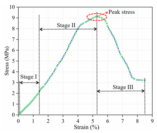 In order to better understand the deformation characteristics and failure characteristics of the modified soil under uniaxial compression, the stress–strain curve of the PP fiber–FA–cement modified silt was studied, and based on this, guiding opinions for the actual project were put forward. Taking the 15th set of the orthogonal test as an example, we plot the measured stress–strain curve in Figure 6.