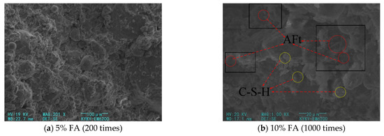 Figure 8 shows the SEM pictures of FA–cement–soil when the FA content is 5% and 10% respectively. It can be seen from Figure 8a that when the amount of FA is small, its main effect is to fill in the form of particles between the soil particles and the hydration product, leaving a part of the FA attached to the cement or soil. At this time, the overall structure of the modified soil is relatively dense, but most of the FA only plays the role of physical filling, and the cement products on the surface of soil particles are less, and there are more bare soil particles; that is, the effect of chemical modification of FA is weaker at a low mixing amount, and the effect of chemical modification of FA is weak. It can be found that the compounding of cement and FA can help improve the compactness of the modified soil, but when there is less FA, less cement can be generated, and the improvement effect is not obvious. It can be seen from Figure 8b that the cement increased, the soil particles are wrapped to form agglomerates, and the needle-like crystal products increased, which mostly appear in the gap between hydrate–hydrate and soil–hydrate. There are crystals in the pores, which play a strong bonding role. At this time, there are only a few small pores in the modified soil, and the overall structure is relatively compact. That is, the mixing of cement with an appropriate amount of FA promotes the generation of cement hydration products and the packaging of soil particles, thereby enhancing the compactness of the structure and effectively improving the strength of the soil.