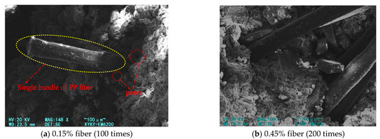 Figure 9 shows the SEM images of the modified soil when the PP fiber content is 0.15% and 0.45%, respectively. In Figure 9a, the fiber content is small, the fibers are tightly embedded in the structure in a single bundle, and there are no obvious pores at the fiber–cement connection, and the mechanical occlusion of the two is strong. When the fiber is broken, the fiber surface shows longitudinal fracture cracks, which indicates that the fiber replaces the skeleton in the space structure to bear part of the external force, which can improve the damage form of the modified soil and reduce the brittleness of the cement–soil to a certain extent. In Figure 9b, the fiber content is too much, and then, a larger bundle-like structure is formed in the modified soil; that is, the fiber is not uniformly mixed, causing several fibers to be juxtaposed together. It can be clearly observed that at this time, the pores at the fiber–skeleton structure connection are large and numerous, the friction between the fiber and the hydration product is reduced, the large bundle structure causes slippage between the two, and the soil structure tends to be unstable.