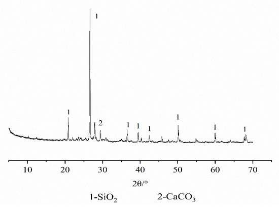 A total of 16 sets of specimens were prepared in this experiment. For the UCS test, 6 parallel test specimens were made in each group to make the results more reliable. The WDW-20 type microcomputer-controlled electronic universal testing machine (The manufacturer of the equipment is Shanghai Precision Instrument Co., Ltd., and the place of production comes from Beijing, China.) was used for the UCS test, and the maximum load is 100 kN, which was loaded at a rate of 1 mm/min until the soil sample was damaged. When using the KYKY-EM6200 scanning electron microscope (The manufacturer of this equipment is Beijing Zhongke Science and Technology Co., Ltd., and the place of production comes from Beijing, China.) to conduct microscopic experiments on the sample soil, we first wiped the small copper table used to fix the sample with absolute ethanol in advance, cleaned the table to ensure cleanliness, and then used carbon conductive glue to stick the test block on the small copper table. Since the modified soil is a non-conductor, the observation quality and clarity of the electron microscope may be affected by the non-reflective electrons and the surface of the soil during observation. The electrical conductivity is improved by plating gold on its surface, and then, the changes within its microstructure are observed experimentally. The milled powder was used for XRD analysis using the test equipment as a D8ADVANCE (The manufacturer of the equipment is Bruker (Beijing) Technology Co., Ltd., and the place of production comes from Germany.) type diffraction analyzer.