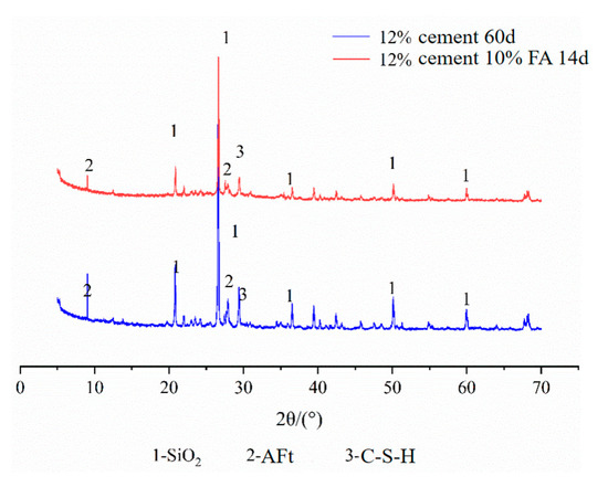 When FA is mixed into cement–soil, a series of chemical reactions will occur, which is called the hydration effect of FA. The main active substances in FA are SiO2 and Al2O3, and these active substances will react with Ca(OH)2 in the hydration products in a relatively strong volcanic ash reaction as well as the generated cementitious substances such as C-S-H and C-A-H. The condensate will connect the soil particles closely, reduce the voids inside the soil, and increase the strength of the soil. In this paper, the maximum admixture of cement is 16%, and the amount of Ca(OH)2 generated by cement due to hydration is limited, so the volcanic ash reaction will stop after Ca(OH)2 is consumed. In addition, XRD diffraction analysis of FA shows that anhydrite (CaSO4) is contained in FA. The C3A in cement will produce tricalcium aluminate hydrate when it meets with water, and it will chemically react with gypsum in FA to produce high-sulfur calcium sulfoaluminate hydrate crystals, namely needle-shaped ettringite [28]. After gypsum participates in the reaction, if the quantity is insufficient, low-sulfur calcium sulfoaluminate hydrate crystals will be formed. The reaction equations of the two are shown in the following Equations (1) and (2). These crystalline substances are distributed in the pores inside the cement–soil and play a role in connection. At the same time, the products of the pozzolanic reaction of FA will also chemically react with gypsum to form crystalline substances, and calcium aluminate hydrate will condense with each other and then form a network and flocculent structure on the surface of the soil particles, and all these reactions have a positive effect on the strength of the specimen.