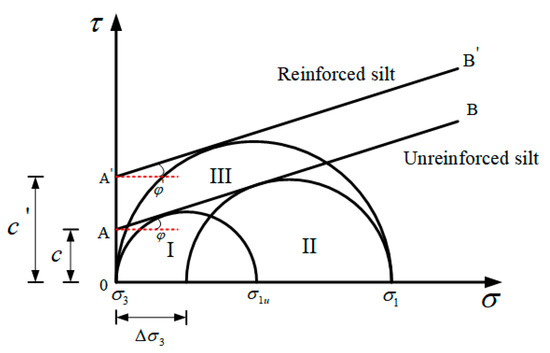 When acts on the fiber-reinforced cement–soil, the modified soil will produce vertical compression and lateral expansion deformation, but the elastic modulus of the fiber is higher than that of the cement–soil, so greater deformation will occur in the cement–soil. According to the principle of deformation coordination, the fiber will produce a lateral constraint on the soil to limit its lateral deformation. The constraint stress is , which is equivalent to applying a lateral pressure to the soil. The following stress molar circle is used to show the reinforcing effect of fibers more visually.