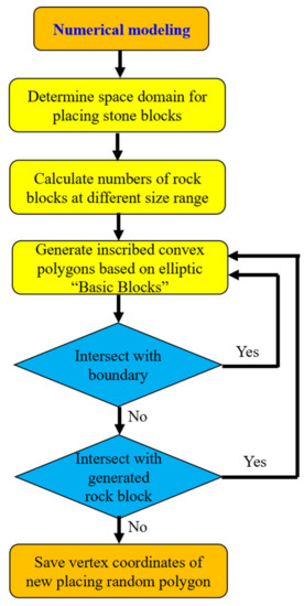 Figure 2 depicts the procedure of S-RM with random structure. As can be seen, Block placement is a process of trial placement, judging the intersection, adjusting the position, and determining the placement. The placement order of the blocks is based on the gradation particle size from large to small, until the rock-block proportions is met.